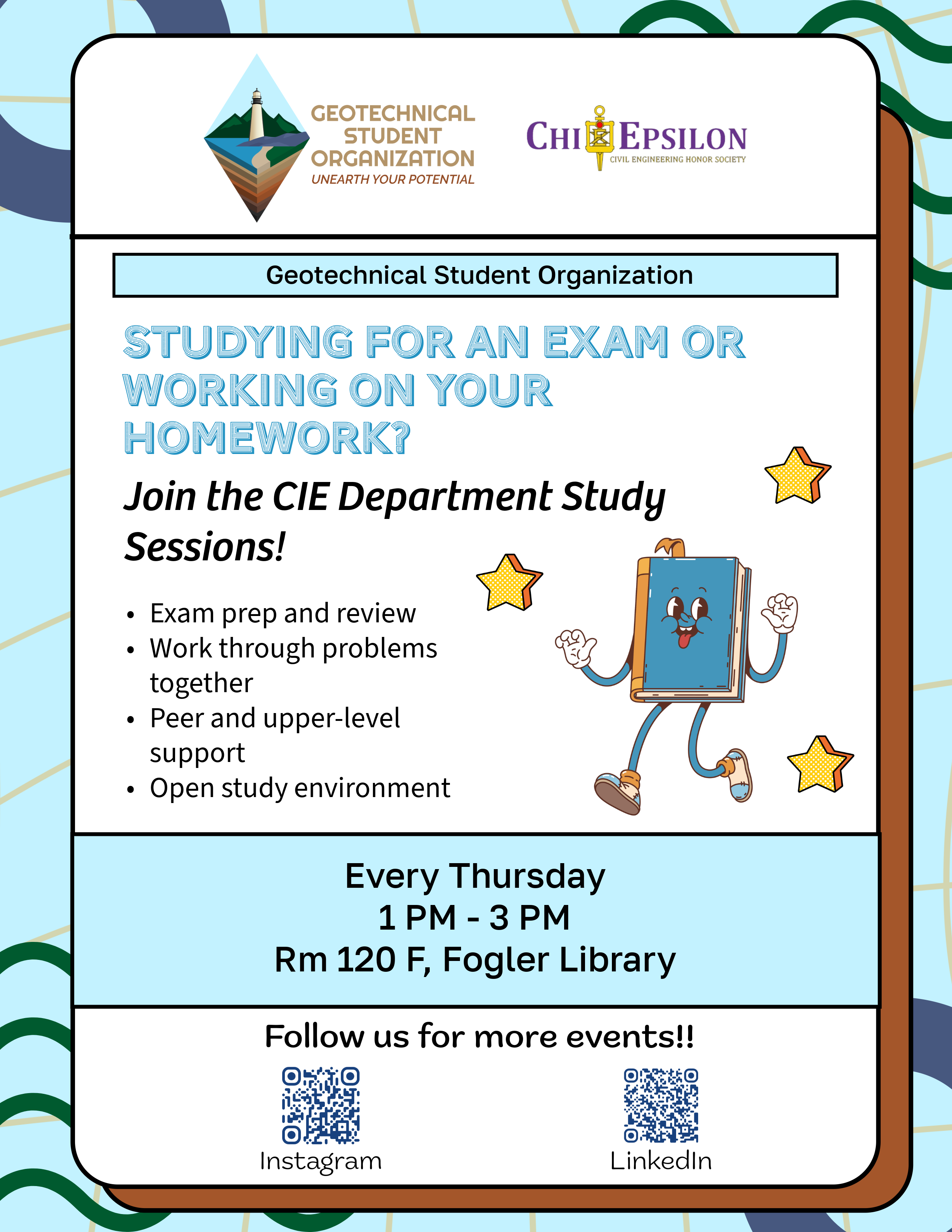 Open to graduate students and undergraduates (Chi Epsilon, ASCE). Study sessions will include FE prep, homework review, and exam preparation.